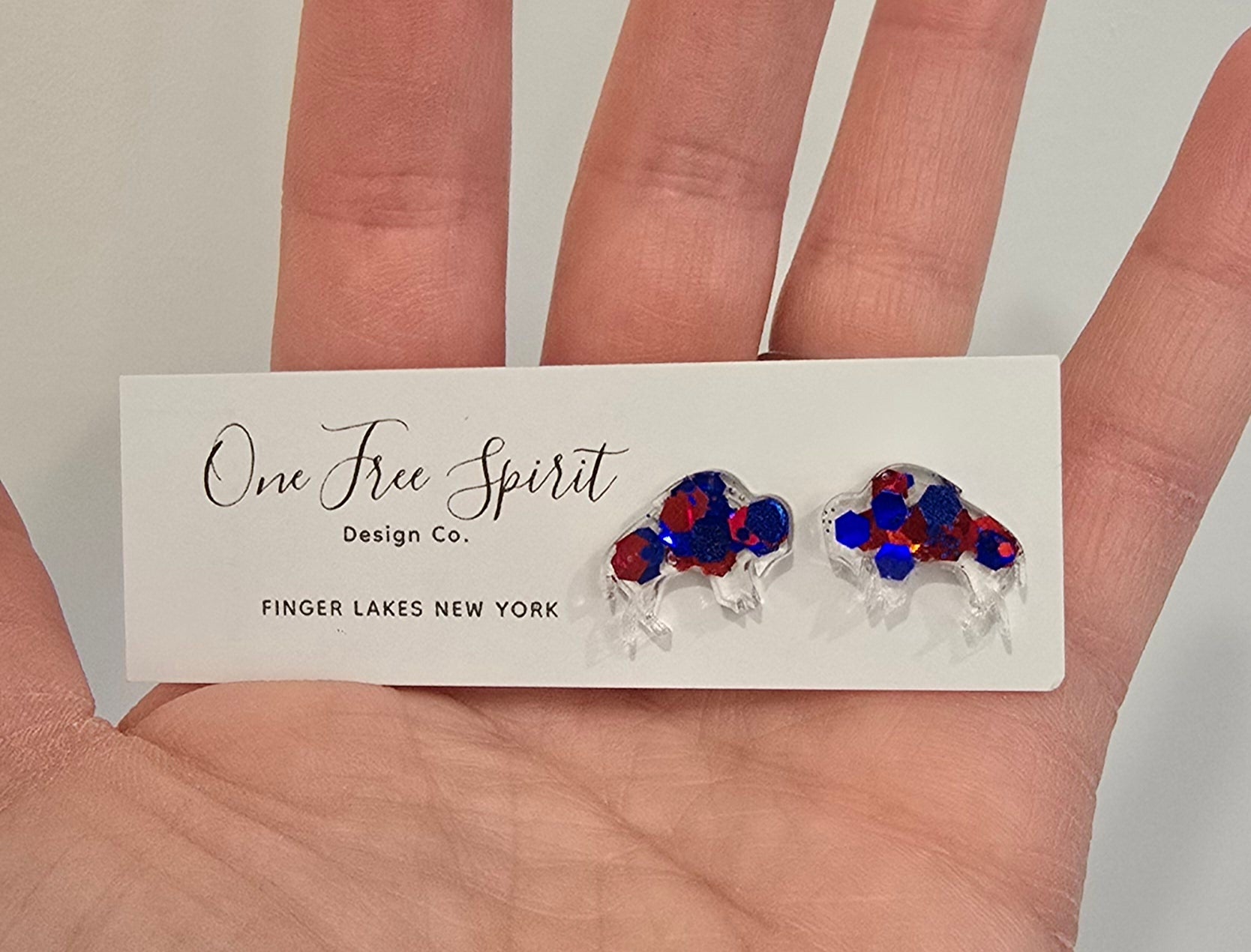 Hypoallergenic buffalo shaped resin earrings with Blue and red sparkles. Each pair may vary slightly in it's glittering pattern as each pair is uniquely handcrafted.
