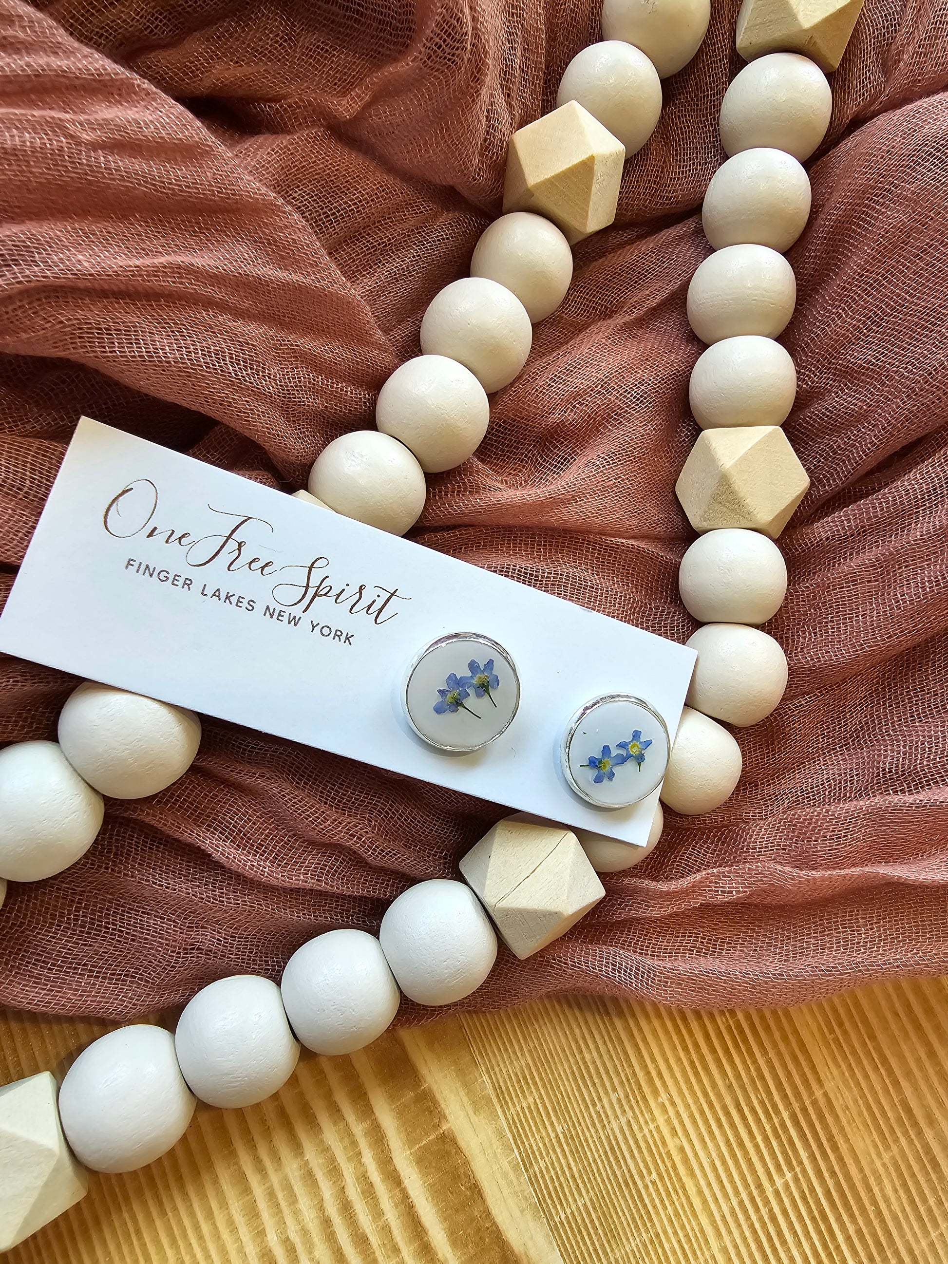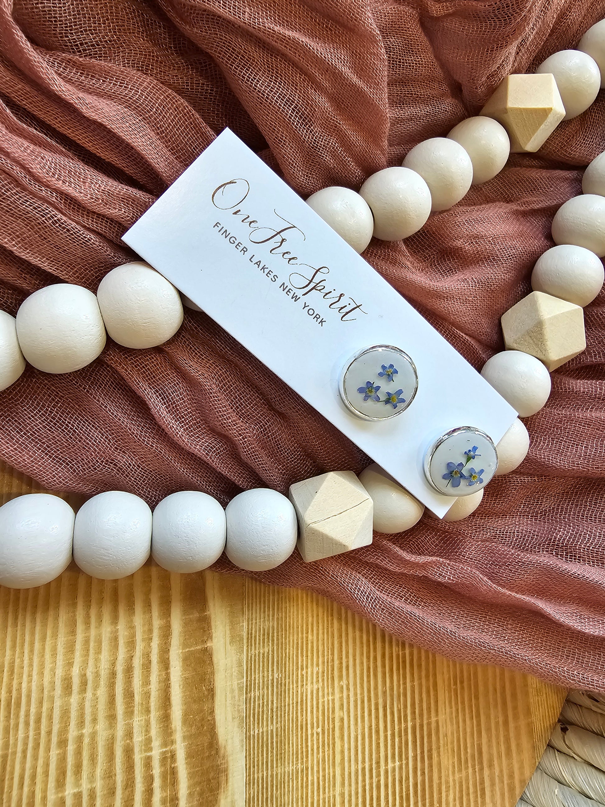Hypoallergenic, nickel-free silver colored cufflinks embedded with white polymer clay and embellished with handpicked and preserved forget-me-not flowers. Each pair is unique containing 2-3 flowers per cufflink.