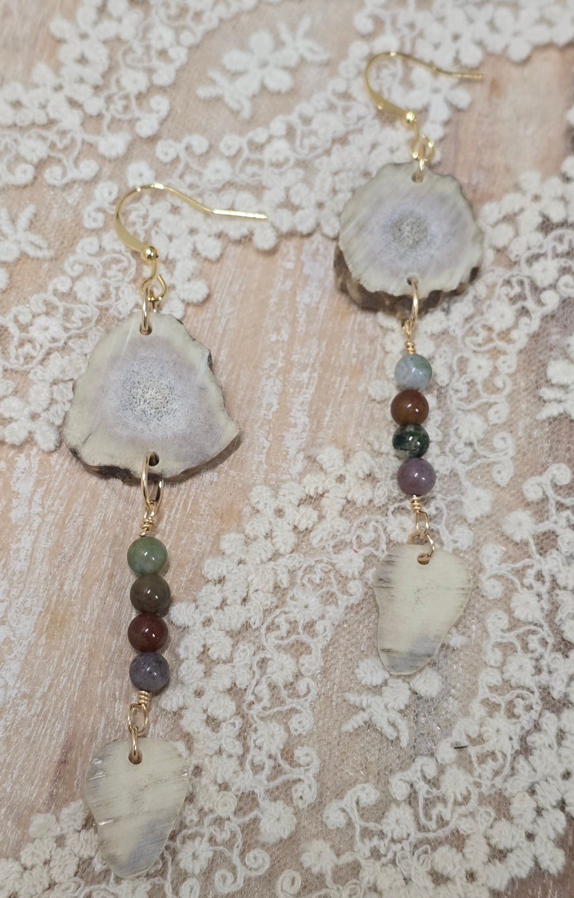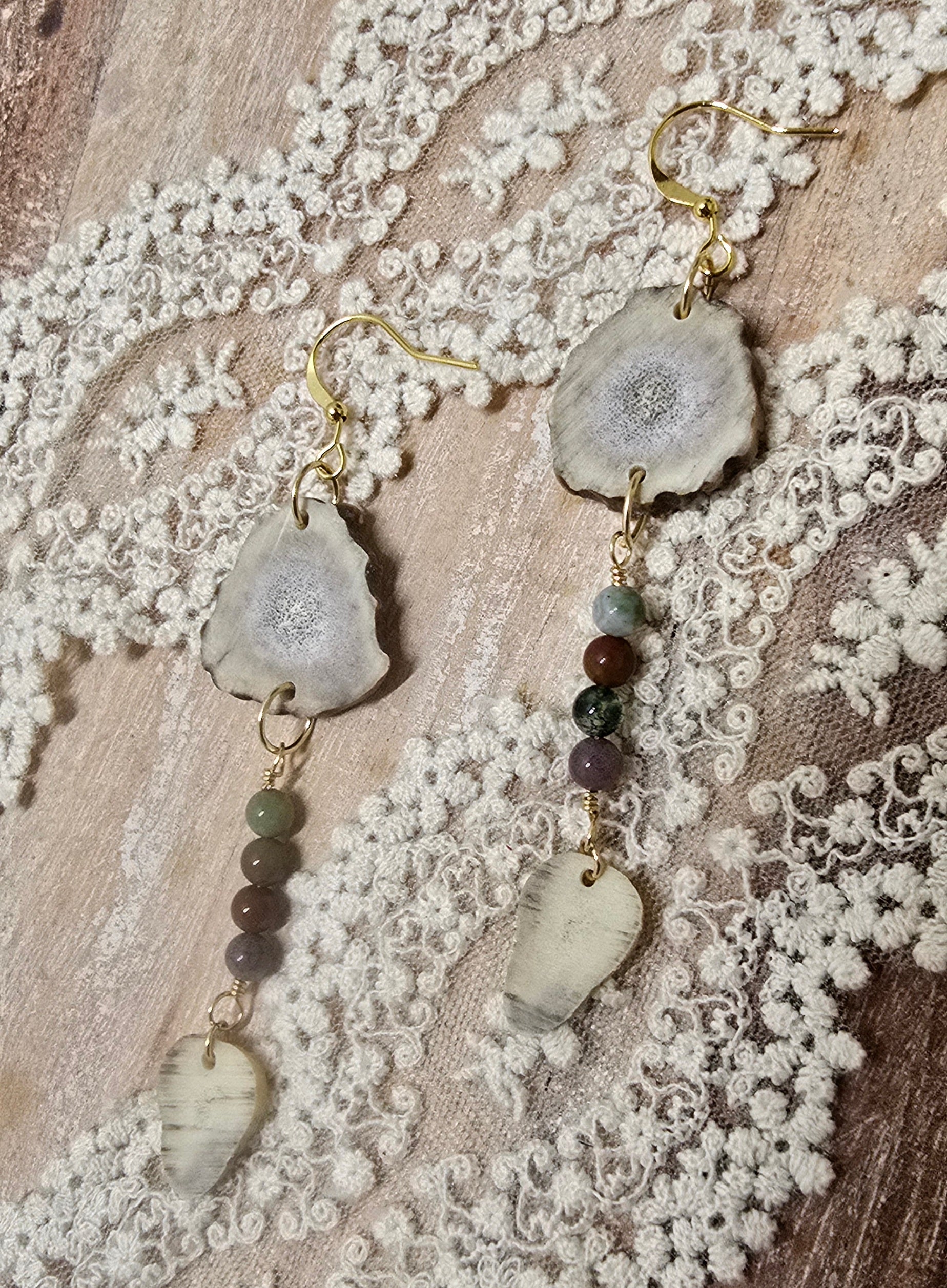 Round jasper dangling from reel antlers accented by 14k gold-filled wire + jump rings and an 18k gold French hook.